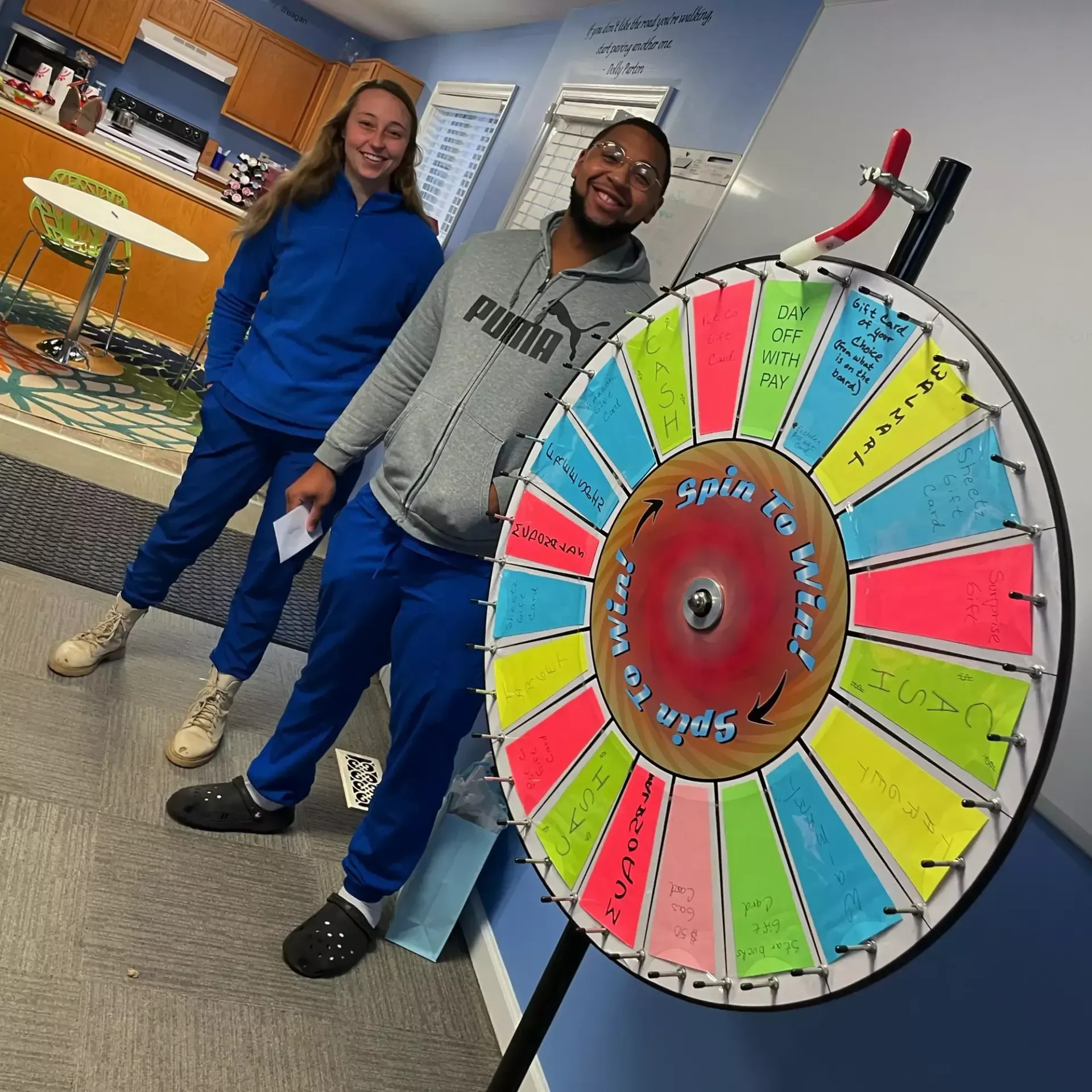 - Engage in fun with our spin and win Prize Wheel after a client gives us a great review.